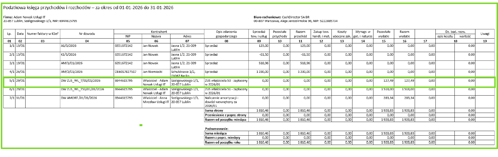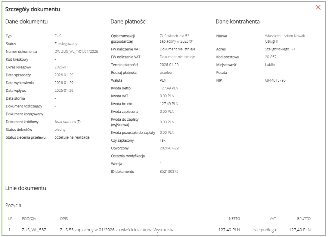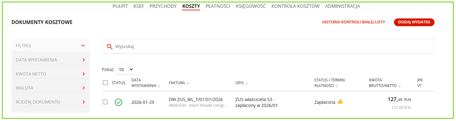 Składka pojawia się na wydruku KPiR oraz w zakładce Koszty/Faktury kosztowe lub Księgowość/Faktury kosztowe z opisem ZUS właściciela 53 – zapłacony w rok/miesiąc.