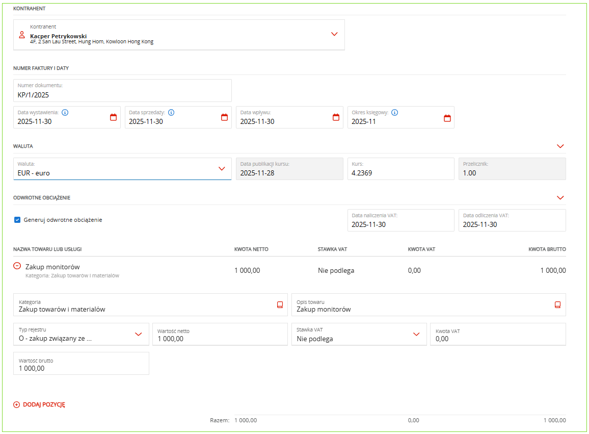 Aby uwzględnić prawidłowe wartości w rejestrze VAT podczas uzupełniania szablonu faktury zakupu, możesz skorzystać z parametru Generuj odwrotne obciążenie. Opcja ta pojawi się automatycznie, gdy w danych adresowych kontrahenta ustawisz kraj inny niż Polska.