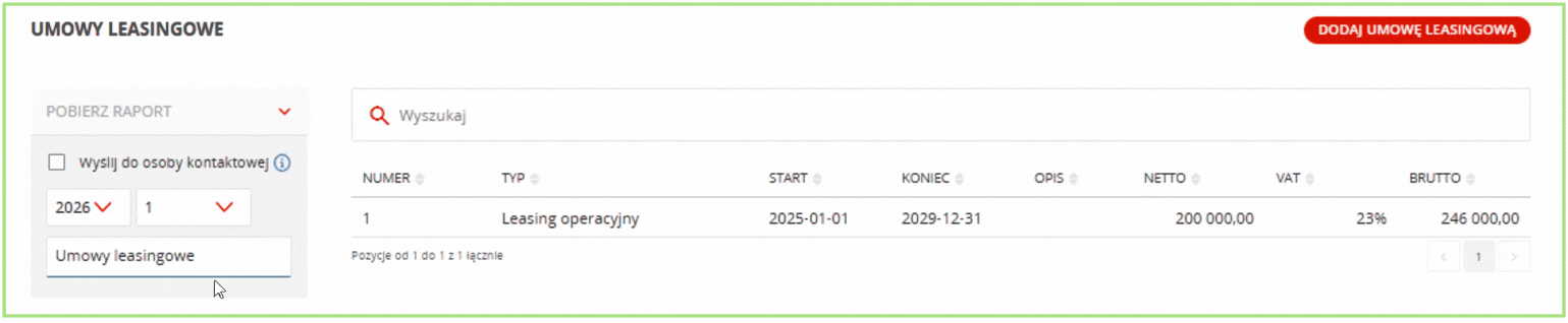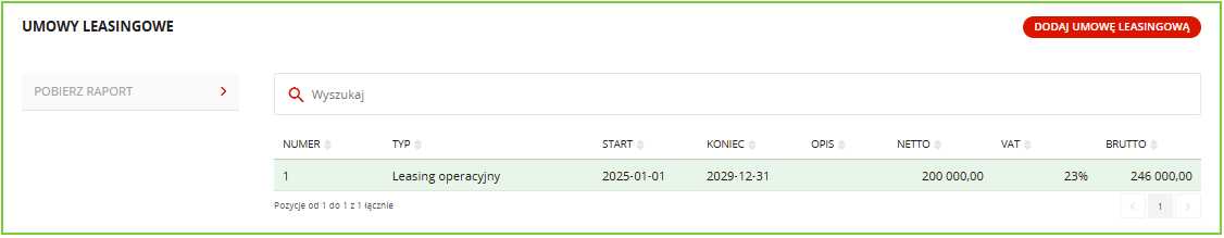 Wprowadzona umowa pojawi się na liście w zakładce Księgowość/Umowy leasingowe.