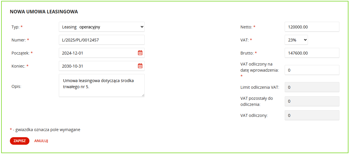 Wyświetli się formularz, uzupełnij go zgodnie z danymi zawartymi na wprowadzanej umowie i zatwierdź przyciskiem Zapisz: