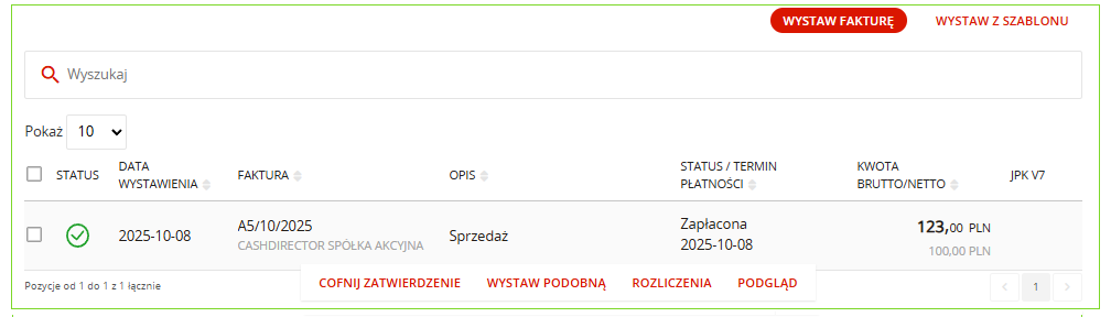 Aby usunąć błędnie wystawioną fakturę sprzedaży, skieruj kursorem na dokument, kliknij Cofnij zatwierdzenie.