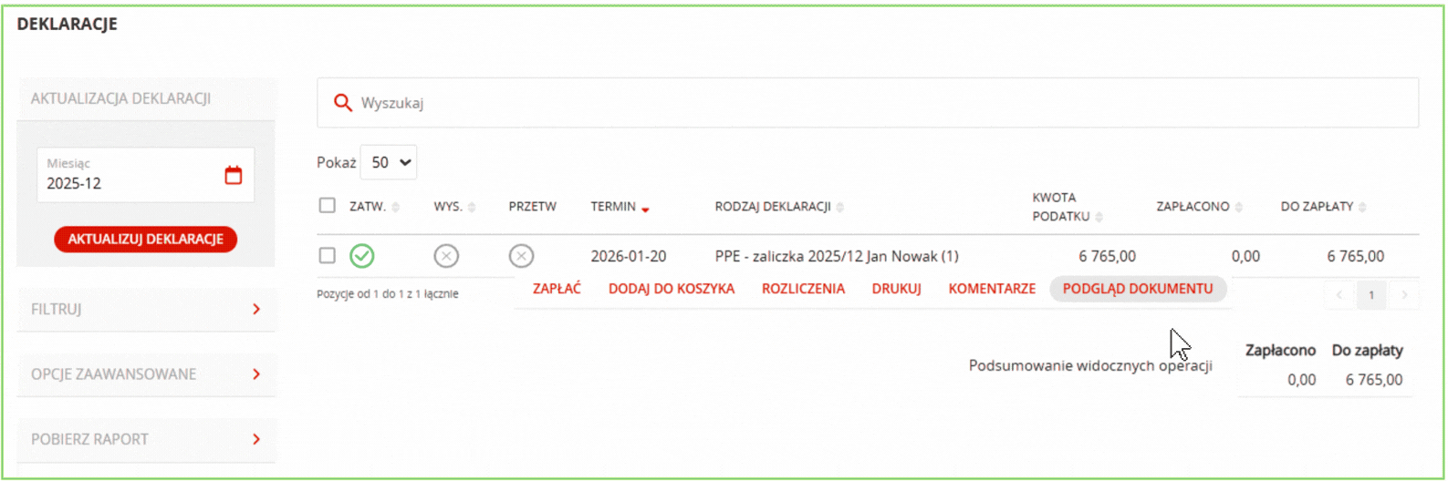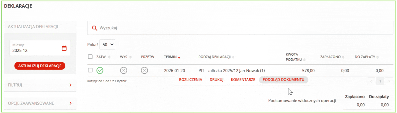 Aby wyświetlić szczegóły, najedź na deklarację i wybierz Podgląd dokumentu.