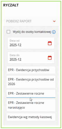 W zakładce Księgowość/Ryczałt, po lewej stronie wybierz opcję Pobierz raport. Ustaw okres 2025/12, a następnie wybierz EPR – Zestawienie roczne.