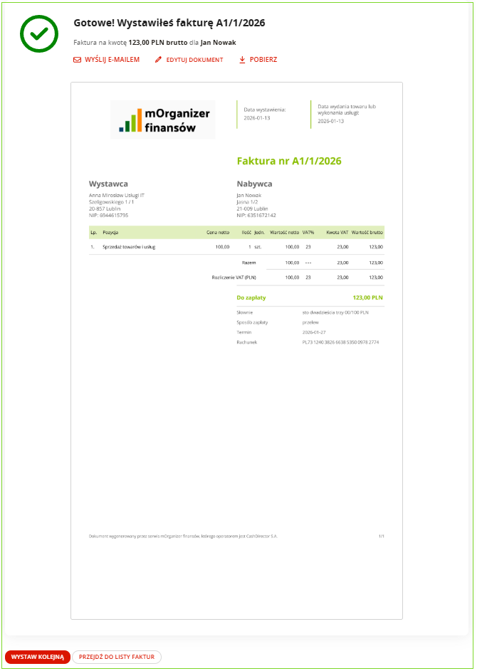 Fakturę sprzedaży możesz wysłać do kontrahenta od razu po jej wystawieniu z poziomu okna sukcesu. W celu wysyłki wprowadź adres e-mail kontrahenta oraz wybierz przycisk Wyślij. Zaznaczając opcję Wyślij również do mnie wyślesz fakturę również na swój adres e-mail.