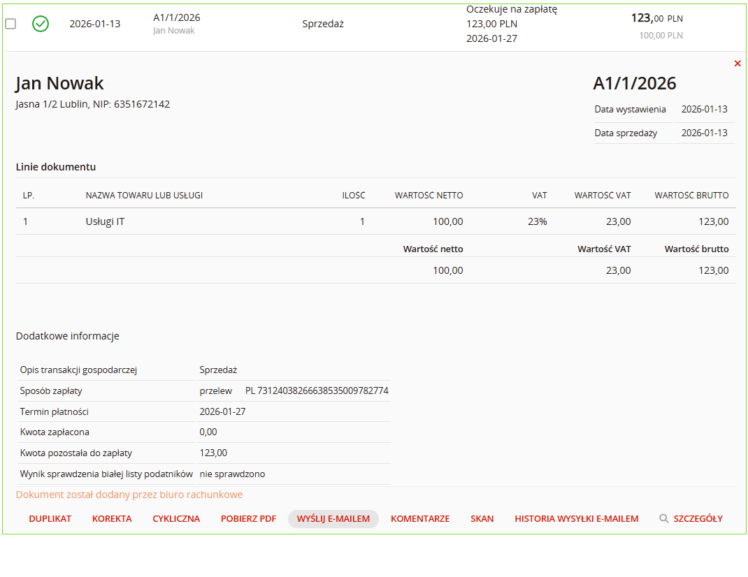 Fakturę możesz wysłać również z poziomu Listy faktur. Po kliknięciu w fakturę i rozwinięciu dokumentu pojawi się opcja Wyślij e-mailem.