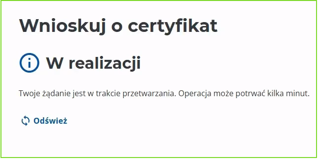 Po wypełnieniu kliknij Wyślij wniosek o wydanie certyfikatu — uruchomi to proces wydawania certyfikatu KSeF. Proces może potrwać kilka minut. Możesz użyć przycisku Odśwież, aby sprawdzić status.