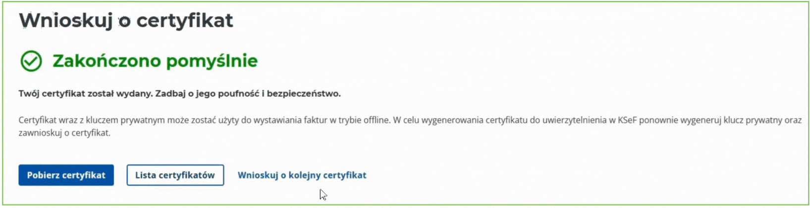 Po poprawnym wydaniu certyfikatu pojawi się komunikat o zakończeniu procesu. Masz wtedy trzy możliwości: