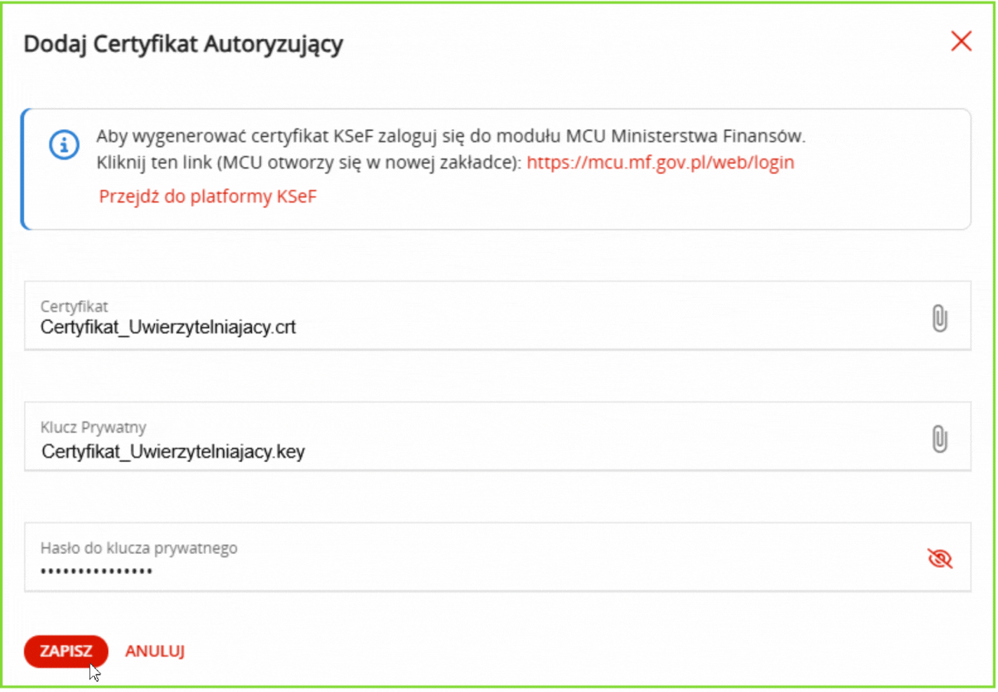 Wgraj certyfikat w formacie .crt, który został wygenerowany w Module Certyfikatow i Uprawnień z przeznaczeniem certyfikatu do Uwierzytelnienia w systemie KSeF. Załącz klucz prywatny w formacie .key. Wprowadź również Hasło do klucza prywatnego, które zostało zdefiniowane podczas generowania certyfikatu oraz zapisz zmiany.