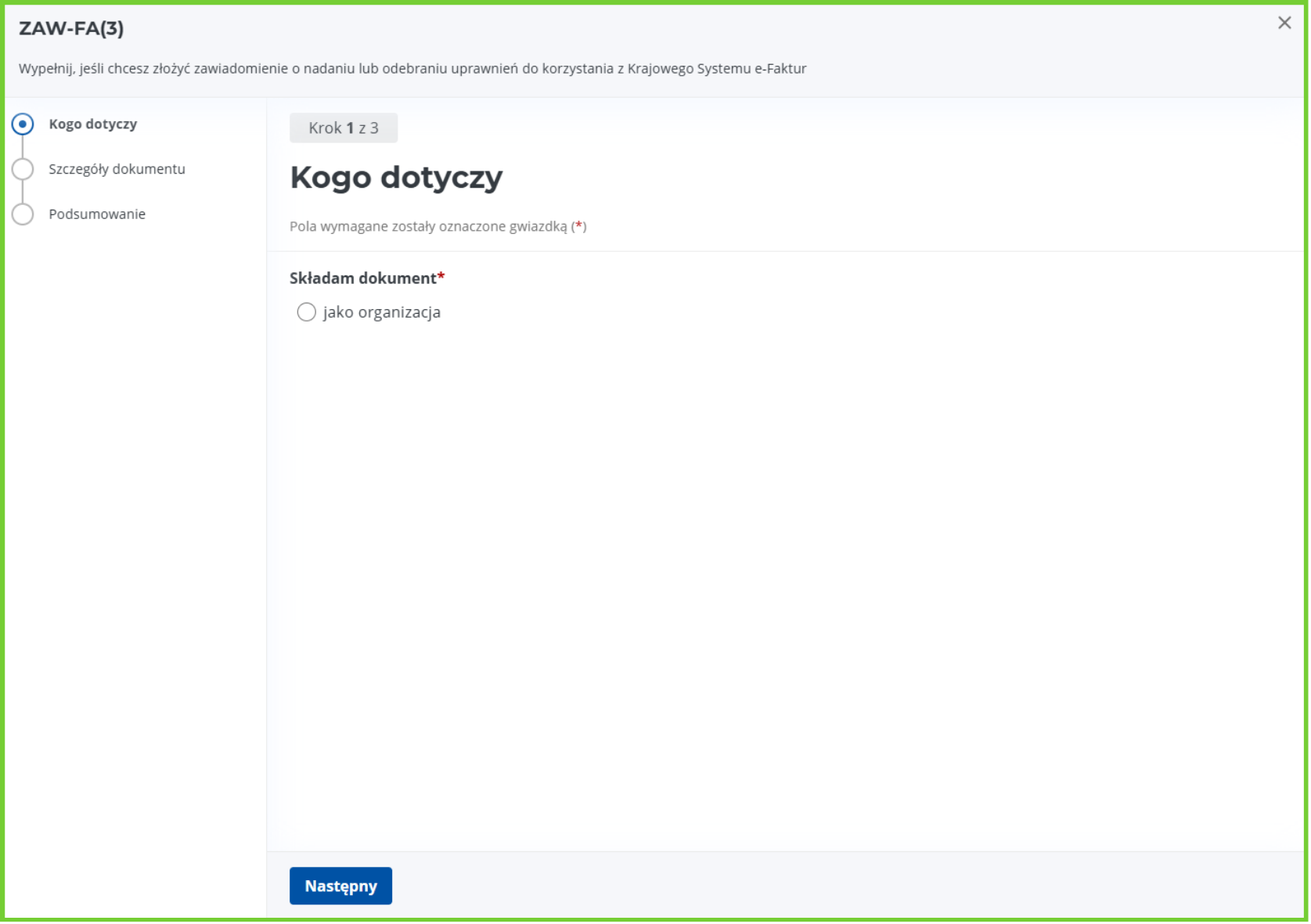 W pierwszym kroku wybierz, czy składasz zawiadomienie: