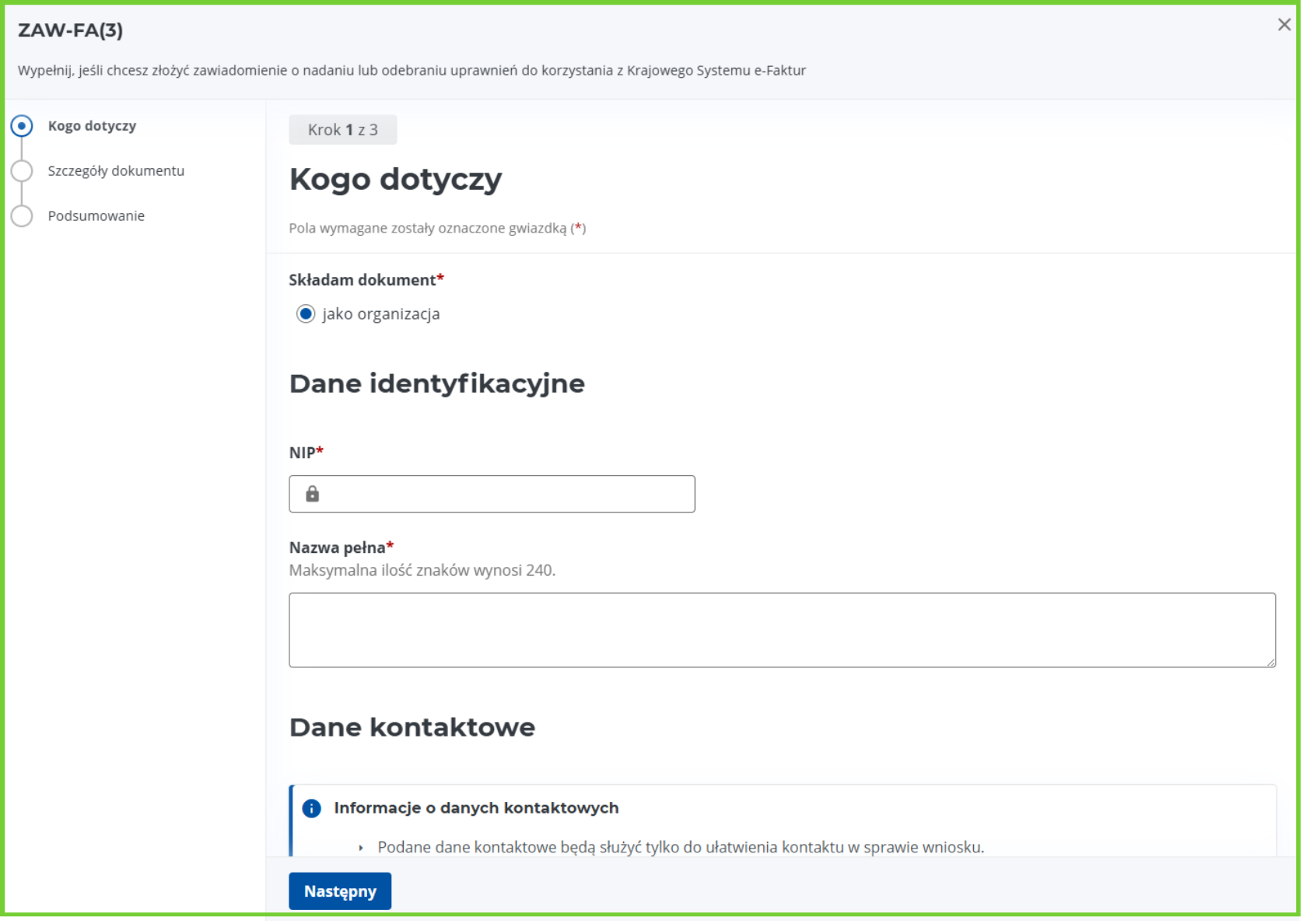 Następnie wprowadź dane identyfikacyjne firmy - określając NIP oraz podając pełną nazwę firmy.