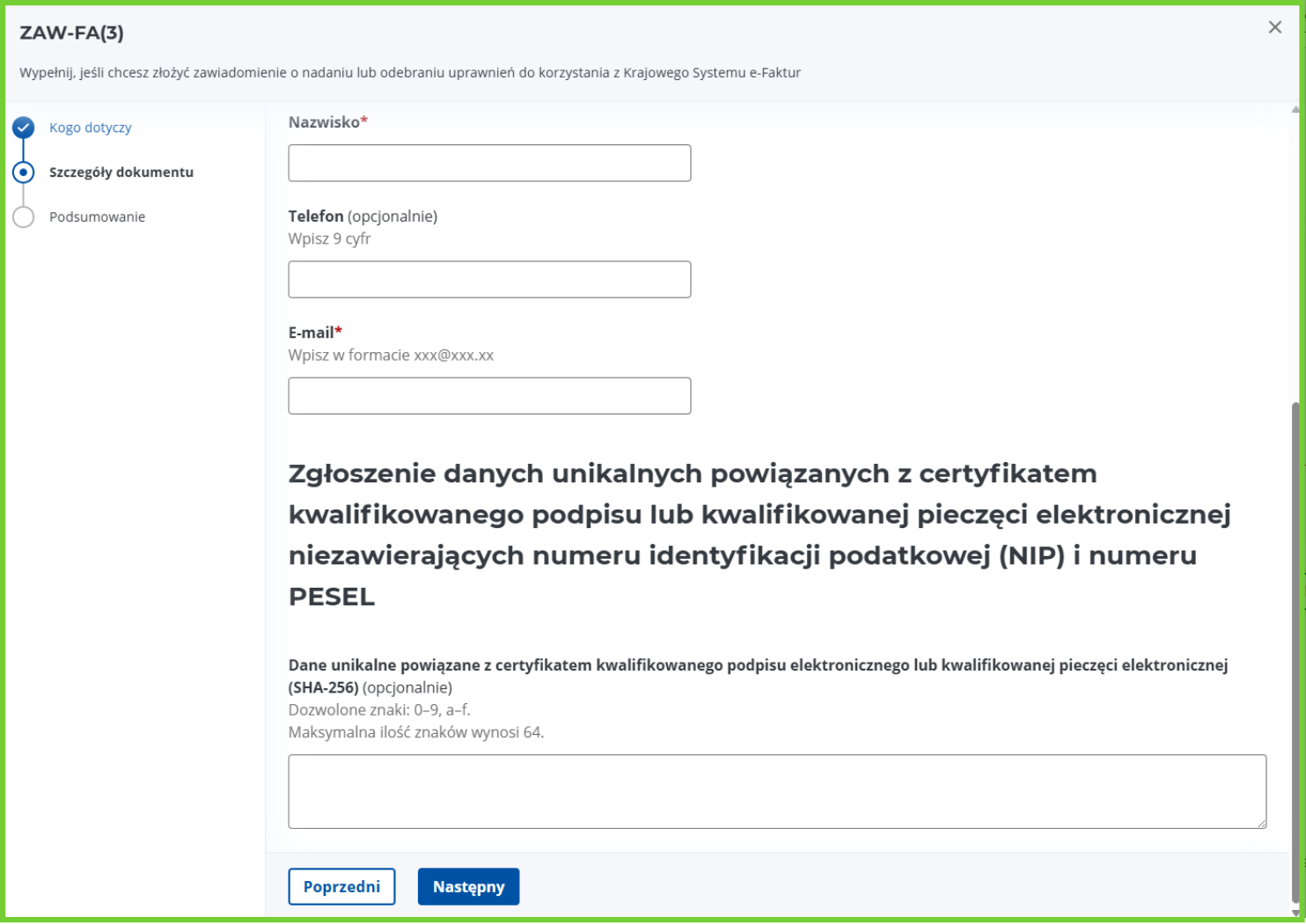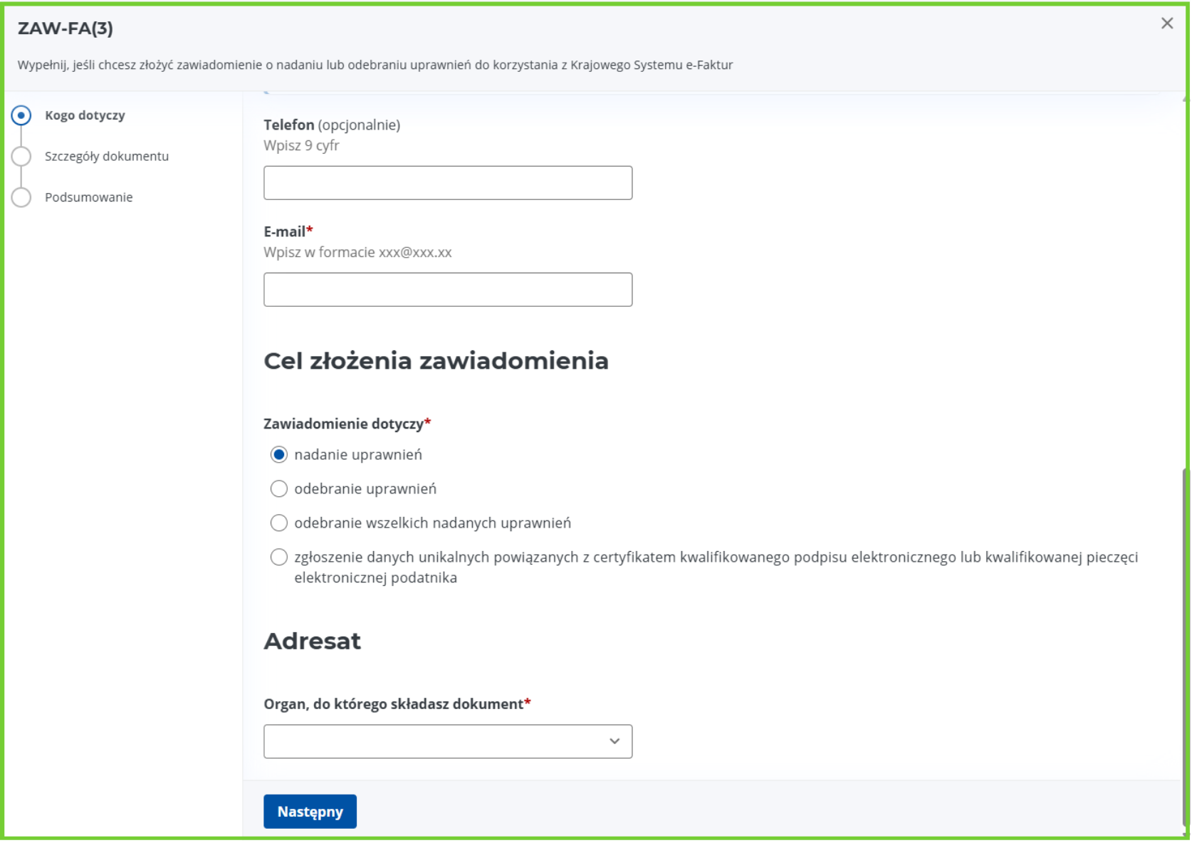 Wprowadź szczegóły dokumentu wskazując dane osoby, którą wskazujesz jako osobę uprawnioną do korzystania z KSeF.