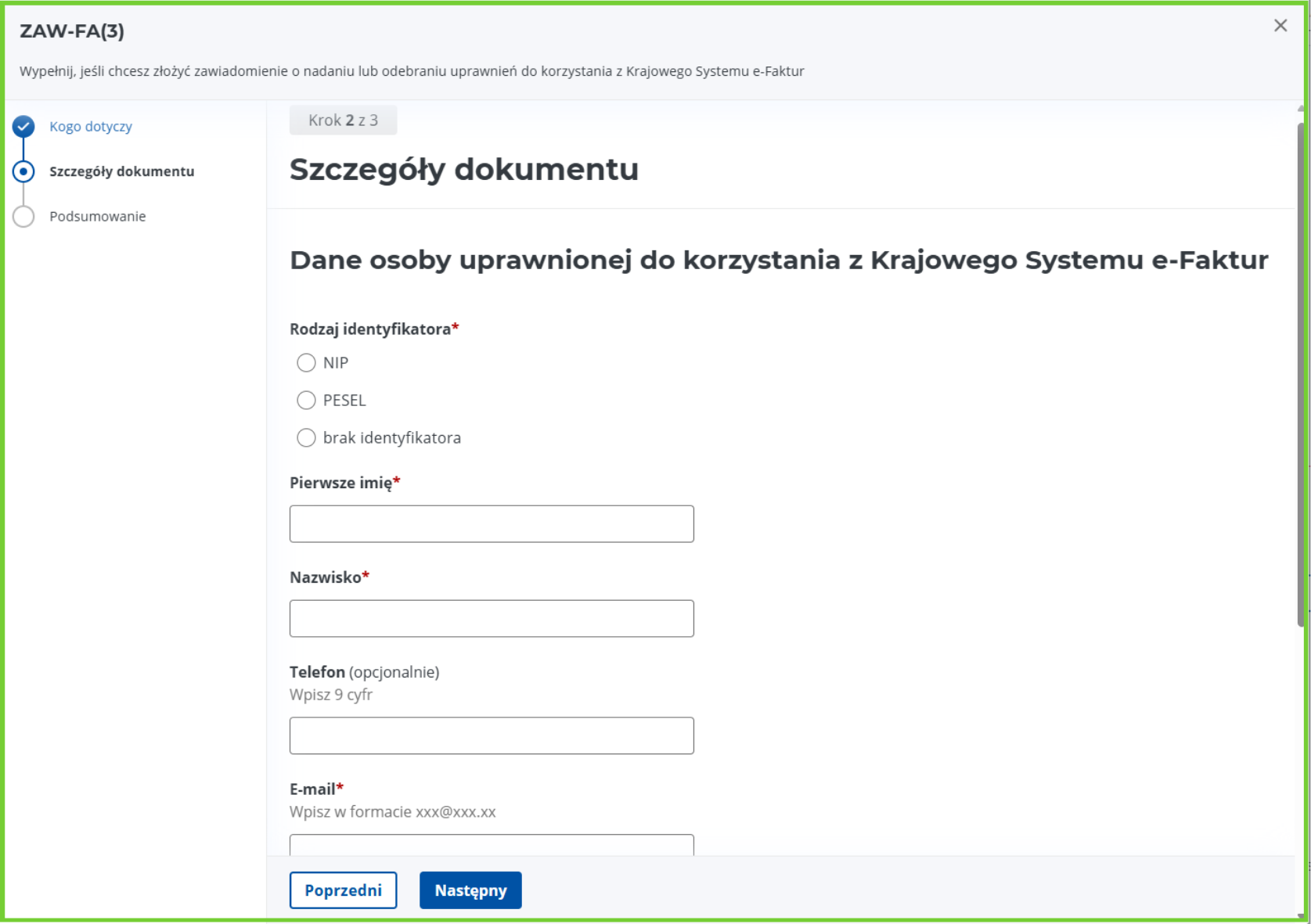 - Identyfikator - NIP lub PESEL