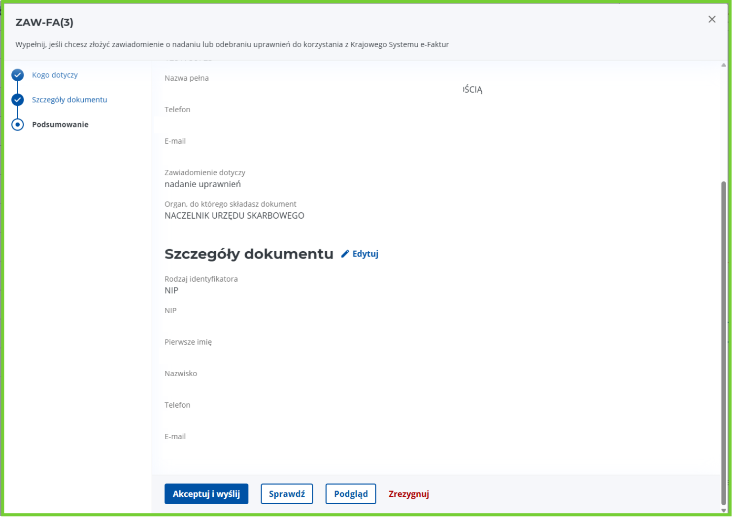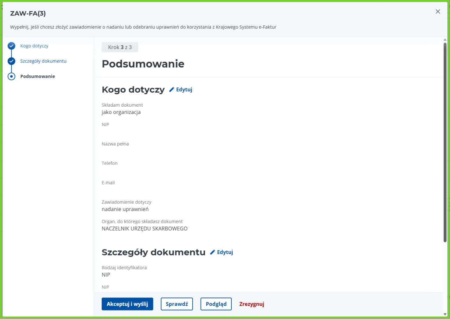 Jeśli wprowadzone dane są poprawne kliknij przycisk Akceptuj i wyślij.