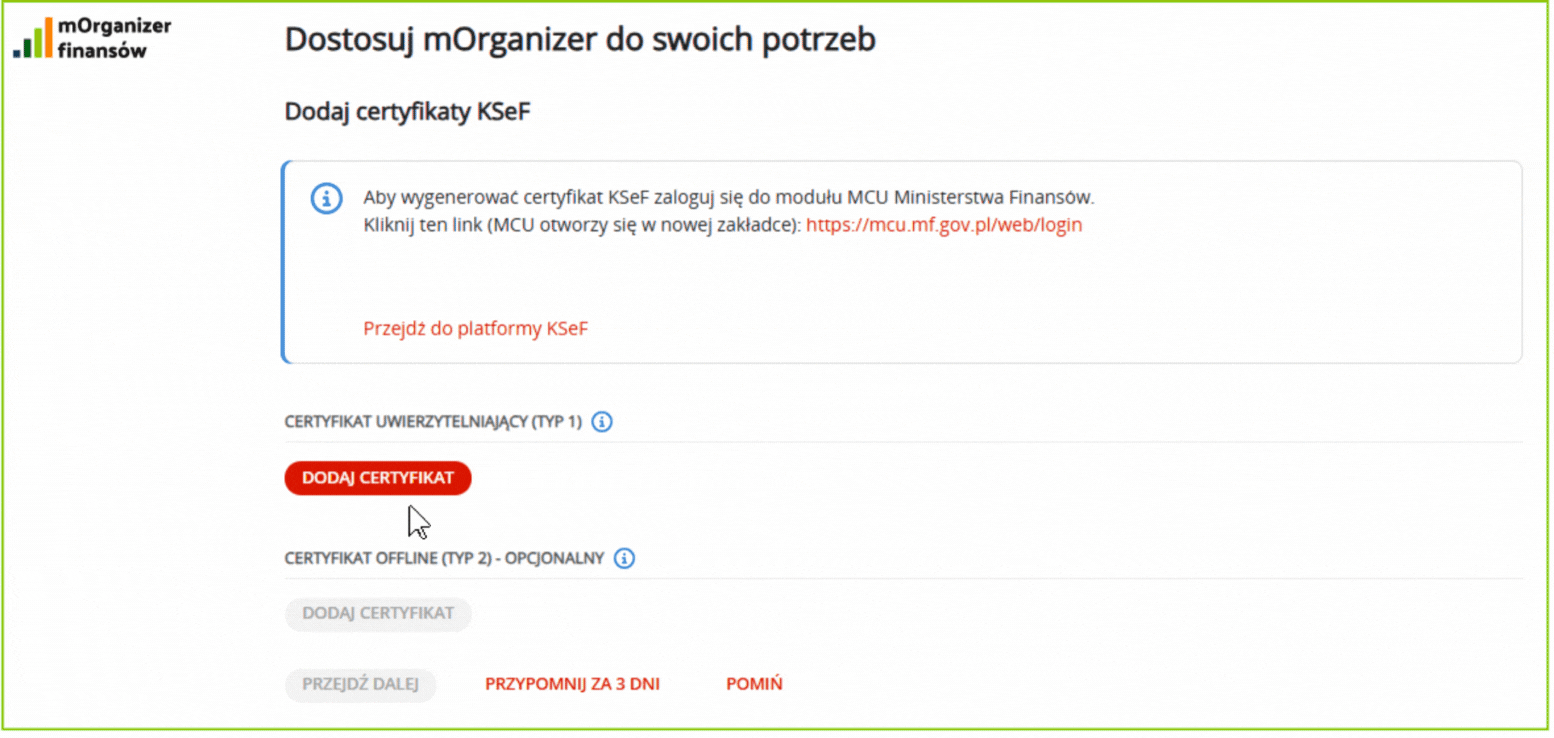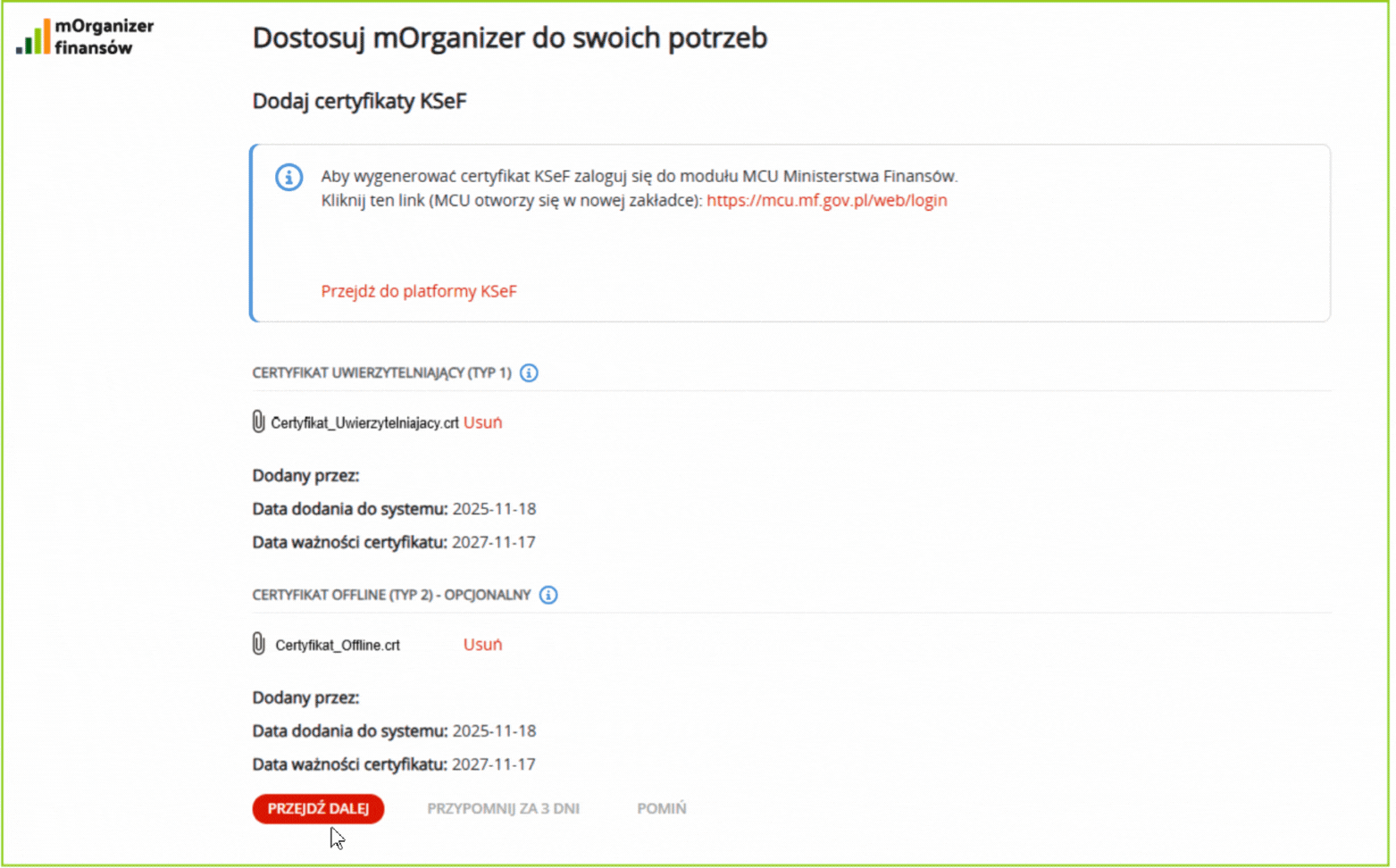 Na koniec wybierz opcję Przejdź dalej. Gotowe. System mOrganizer jest już połączony z KSeF.
