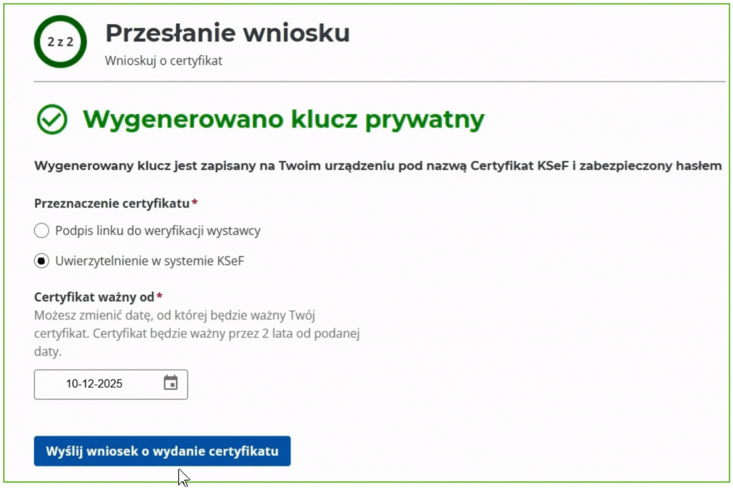 Uzupełnij również pole Certyfikat ważny od. Certyfikat będzie ważny przez 2 lata od tej daty. Możesz zmienić datę początku ważności na przyszłą.