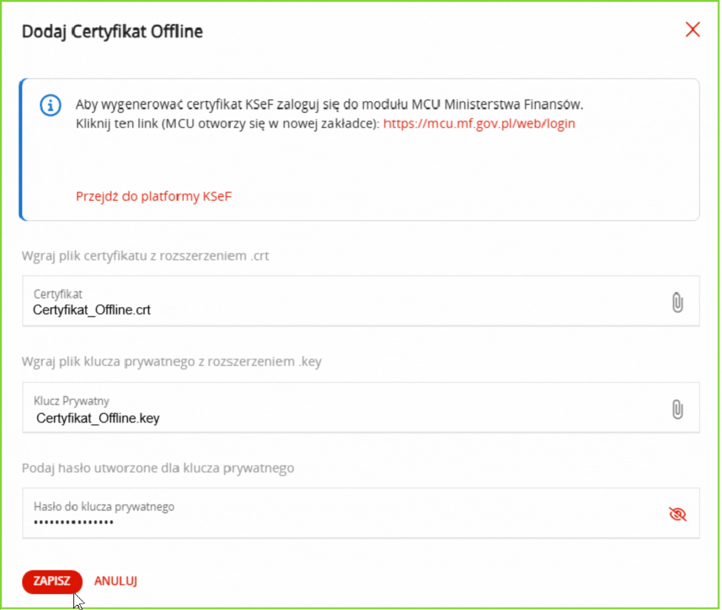 Wgraj certyfikat w formacie .crt, który został wygenerowany w Module Certyfikatow i Uprawnień z przeznaczeniem certyfikatu do Uwierzytelnienia w systemie KSeF. Załącz klucz prywatny w formacie .key. Wprowadź również Hasło do klucza prywatnego, które zostało zdefiniowane podczas generowania certyfikatu oraz zapisz zmiany.