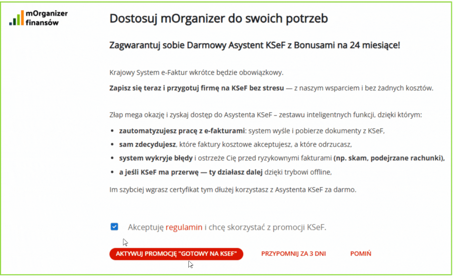 1. Zaloguj się do systemu mOrganizer finansów.Zapoznaj się z wyświetlonym komunikatem, zaakceptuj regulamin i kliknij Aktywuj promocję "Gotowy na KSeF".