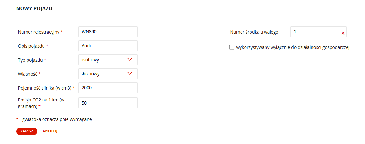 W systemie mOrganizer finansów w zakładce Księgowość/Pojazdy jest możliwość ujęcia emisji CO2 dla konkretnych typów własności pojazdów. W systemie domyślnie uzupełniony jest kafelek Emisja CO2 na 1km (w gramach) z wartością 50. Bardzo istotne jest sprawdzenie czy dany pojazd emituje daną ilość CO2 - w innym przypadku należy zmienić tą wartość na prawidłową: