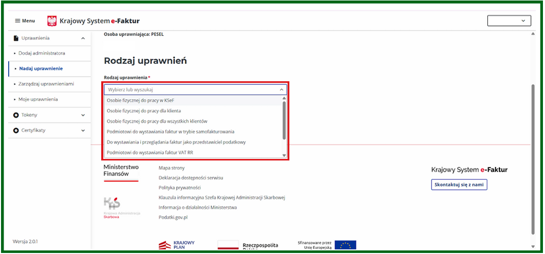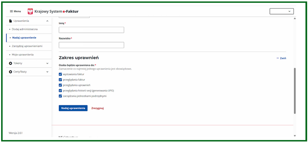 Uwaga: Jeżeli jesteś administratorem i chcesz wystawiać lub pobierać faktury z KSeF musisz nadać uprawnienia samemu sobie.