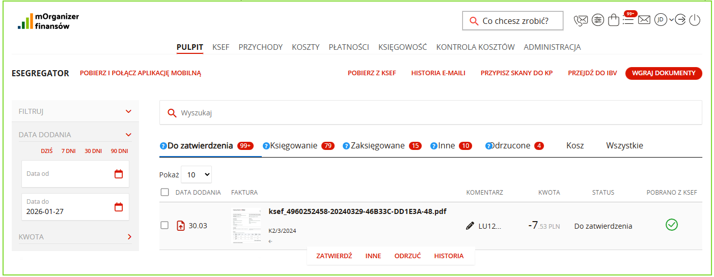 Po przejściu do zakładki Pulpit/eSegregator/Do zatwierdzenia dostępna jest lista wszystkich dokumentów pobranych z Krajowego Systemu e-Faktur automatycznie wraz z nadanym im numerem KSeF ID.