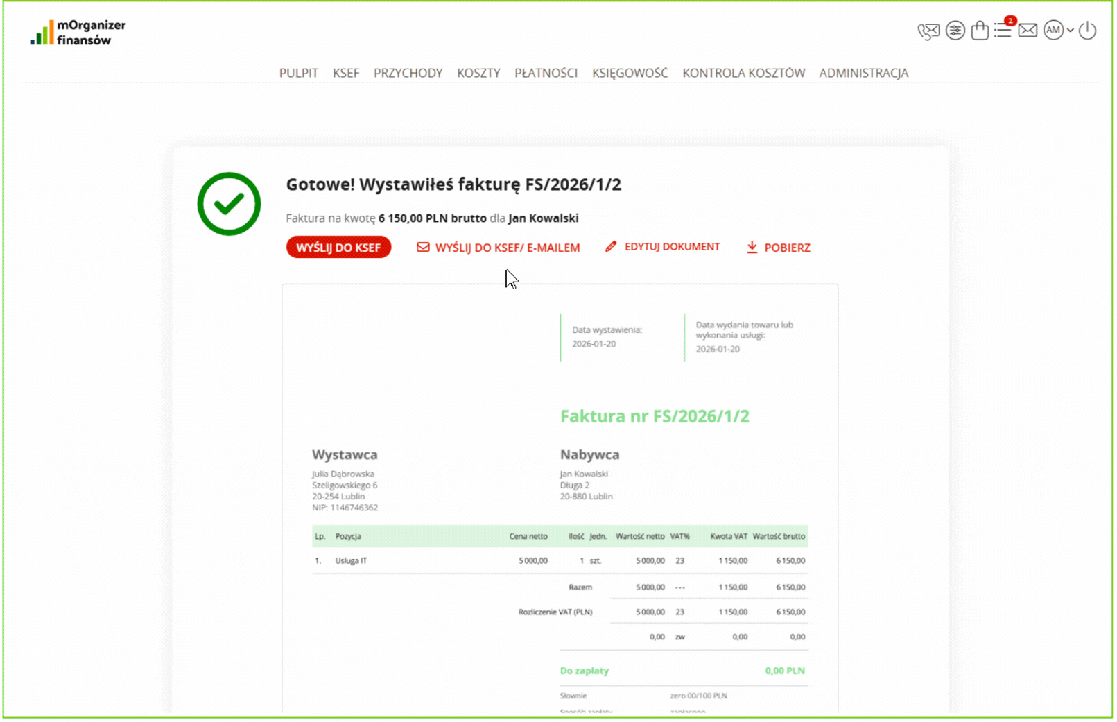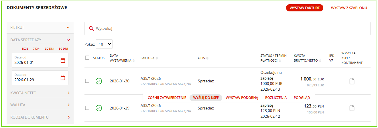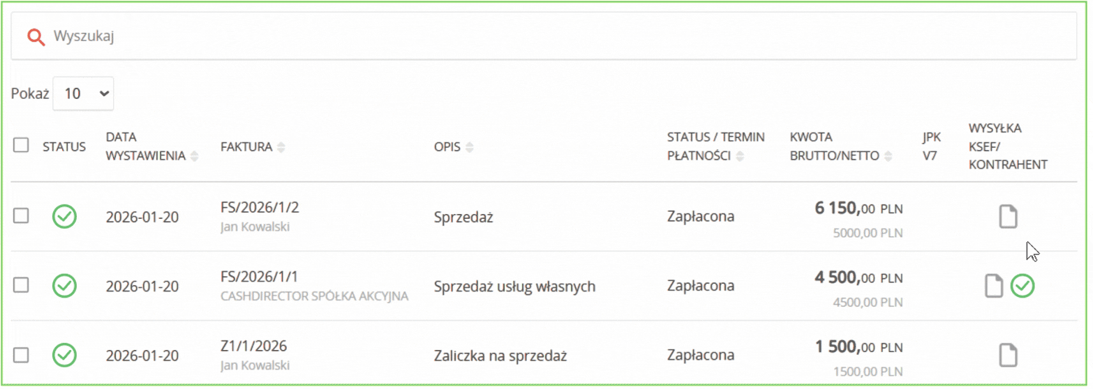 - zleca wysyłkę dokumentu do KSeF,