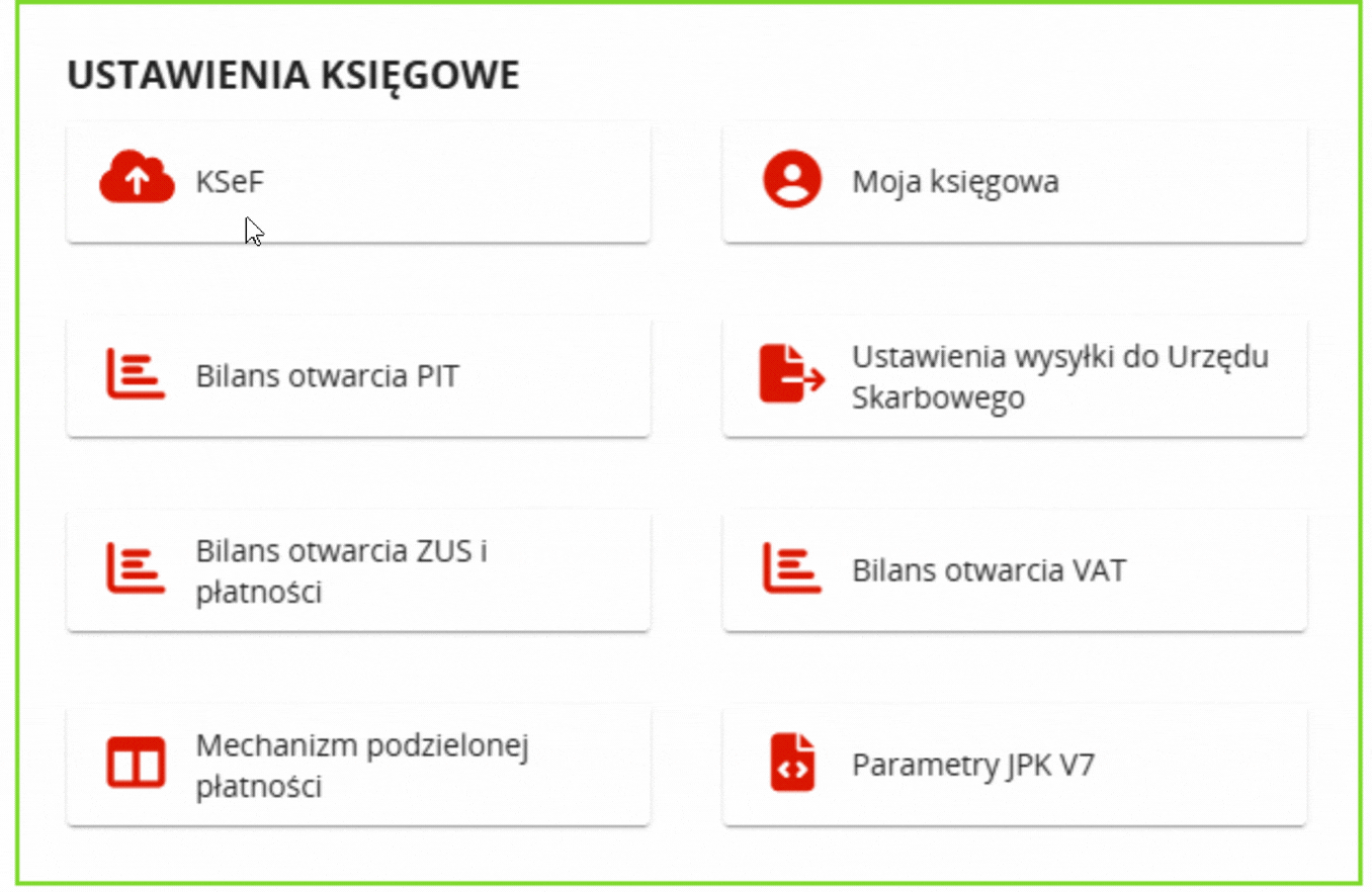 W celu wprowadzanie ustawień dotyczących KSeF przejdź do sekcji Ustawienia/Ustawienia księgowe/KSeF.