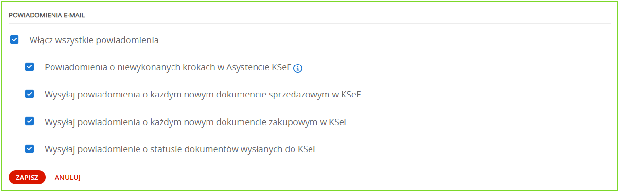 Sekcja Powiadomienia e-mail umożliwia konfigurację powiadomień e-mailowych związanych z obsługą KSeF.