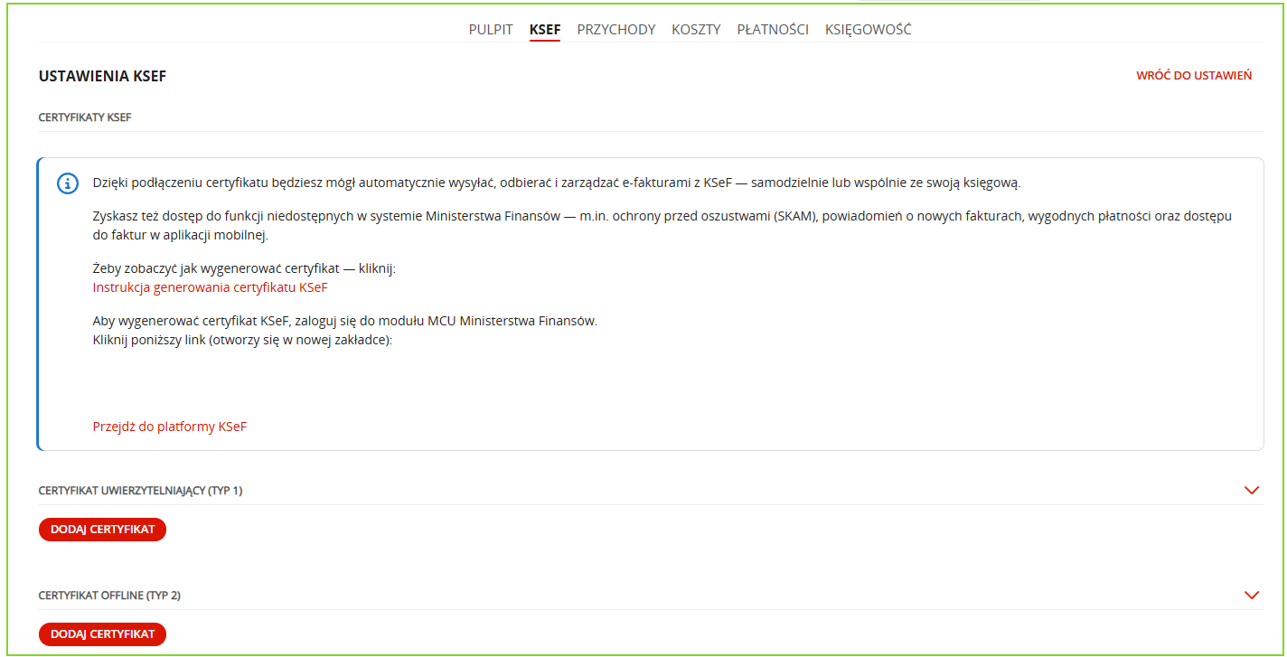 W sekcji Certyfikaty możliwe jest zarządzanie certyfikatami wykorzystywanymi w KSeF.