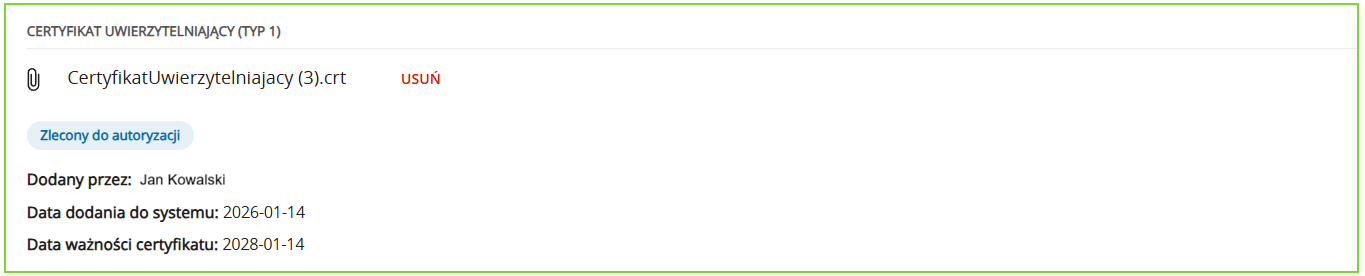 Po poprawnym dodaniu certyfikatu system zapisuje certyfikat w systemie oraz aktualizuje jego status,