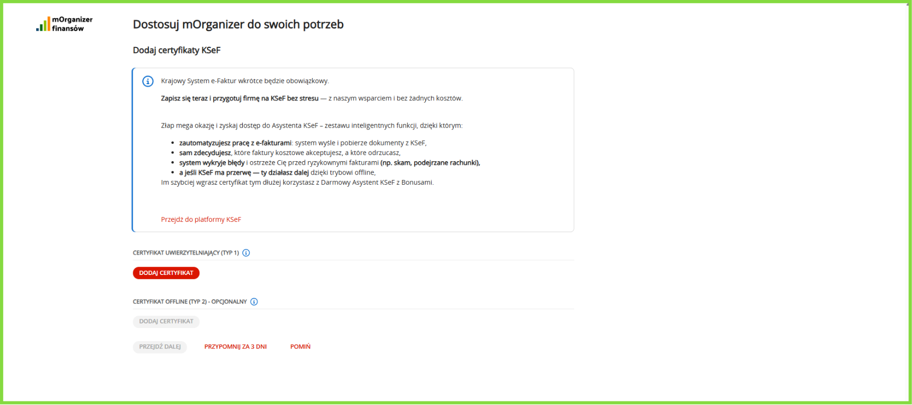 Ekran powitalny – możliwość wgrania certyfikatu bezpośrednio po pierwszym zalogowaniu do Systemu,
